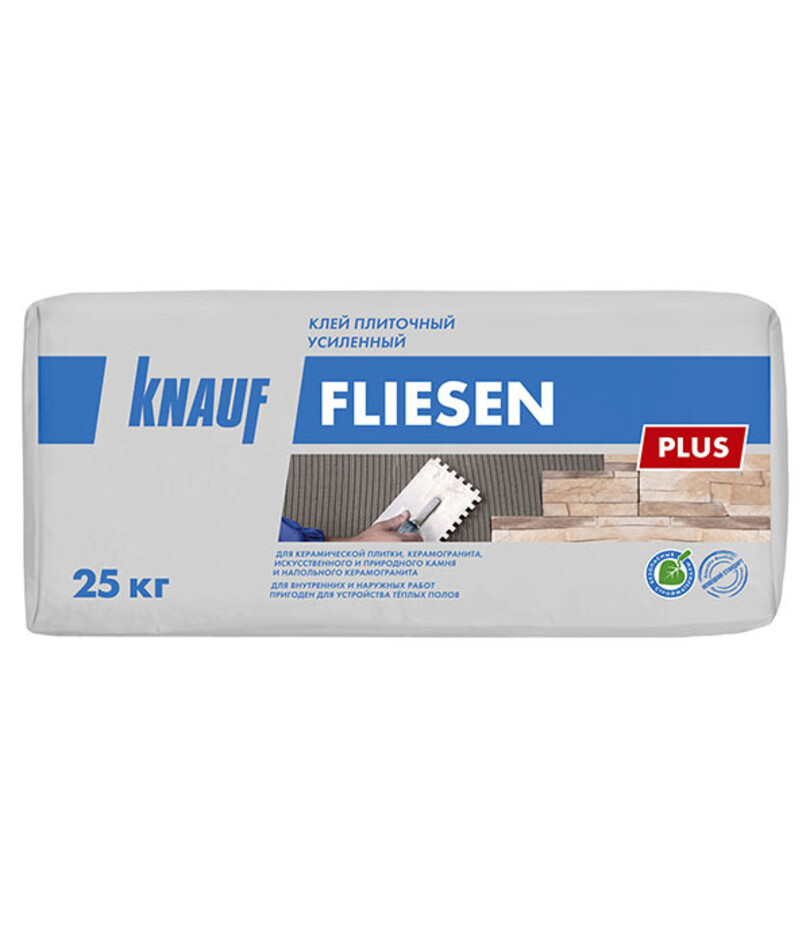 Клей плиточный усиленный КНАУФ-Флизен Плюс предназначен для облицовки внутри и снаружи зданий (включая цоколь): – стен керамической плиткой, керамогранитом, природным и искусственным камнем до 60х60 см и весом до 60кг/кв. м